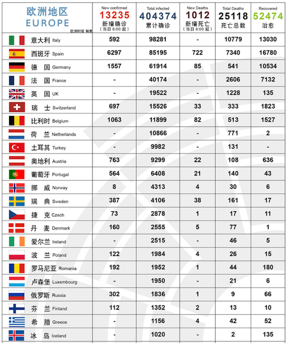 这是截取欧洲时报统计中感染数过千的欧洲国家,没有新增确诊的数据还未上报。
