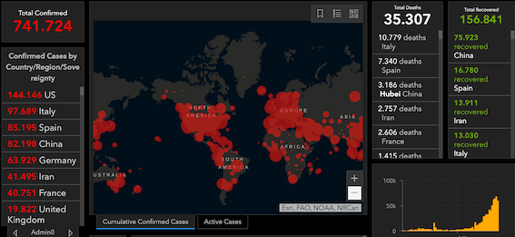 根据约翰·霍普金斯大学在线统计数据,新冠病毒已经造成35307人死亡。专家估计,没有记录在案的实际数字可能更高。到目前为止全球已有741724人感染了Sars-CoV-2病毒,当然,这个数据也存在很多没有计入统计的缺憾。