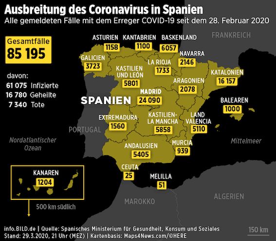 西班牙的疫情严重,在过去的24小时内,有812例新的死亡病例,比周日少26例。这是西班牙新增死亡人数首次出现减少。西班牙总感染病例超过8.5万,医护人员感染人数超过12000人,占所有感染比例15%。西班牙从3月15日实施禁足令以来,新增感染病例从25日开始出现逆转趋势。